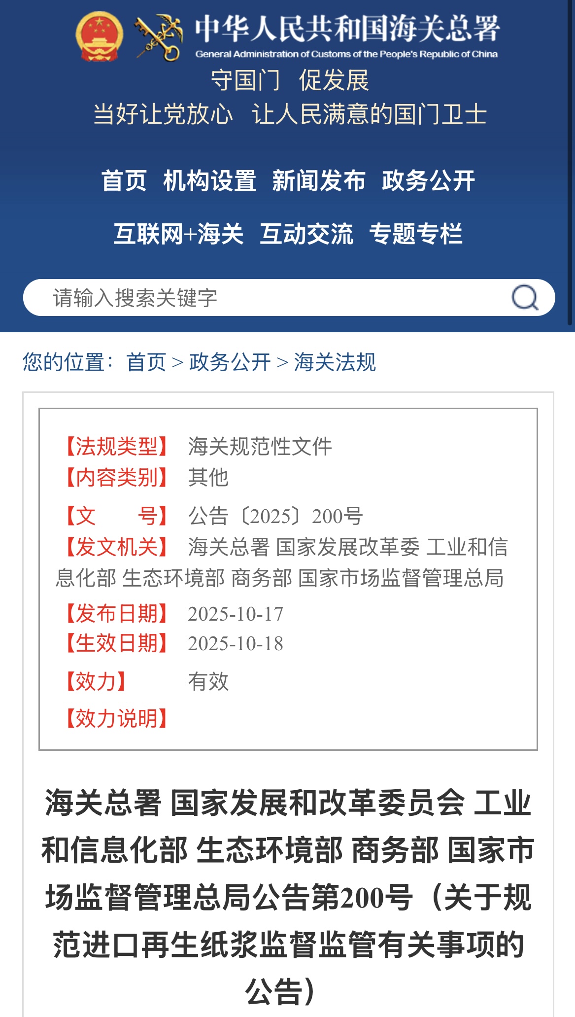 10月17日,六部门联合发布关于规范进口再生纸浆监督监管有关事项的公告。海关总署网页图片