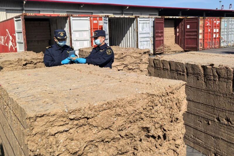 青岛海关查获的以再生纸浆(块状)名义申报入境的“洋垃圾”。图片来源:青岛海关